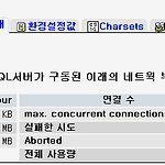 MySQL 런타임 상태 보기 phpMyAdmin 에 접속해서 첫 페이지에 나오는 메뉴중 하나인 "MySQL 런타임 상태 보기"를 클릭하면 나오는 화면이다. 실패한 시도가 눈에 거슬린다. ● 최대 접속수 연결 수의 "max. concurrent connections" 에 나오는 수치는 동시에 connection된 접속수이다.Too many open files 에러 발생으로 더 이상 최대접속수가 301에서 더이상 올라가지 못한 상태의 상황이다.show status like 'Max_used_connections';의 값은 301로 나온다. show variables like 'max_connections';의 값은 1000으로 설정된 상태이며, show variables like 'open_files_lim..