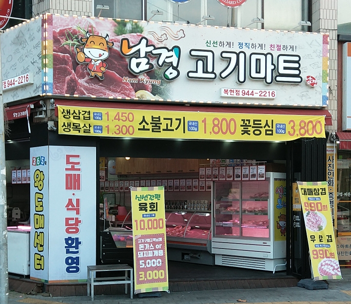 어렵게 예약한 금호강오토캠핑장에 가기전에 복현오거리에 있는 남경고기마트에 잠시 들려서 등갈비랑 육회를 구매했습니다~