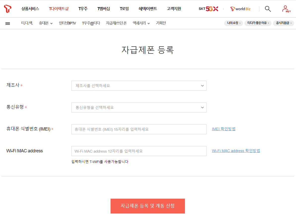 자급제폰 등록을 누르신 다음에 가지고 계신 휴대폰의 제조사, 통신유형, IMEI, MAC Address 값을 입력한 후 자급제폰 등록 및 개통 신청을 누릅니다.