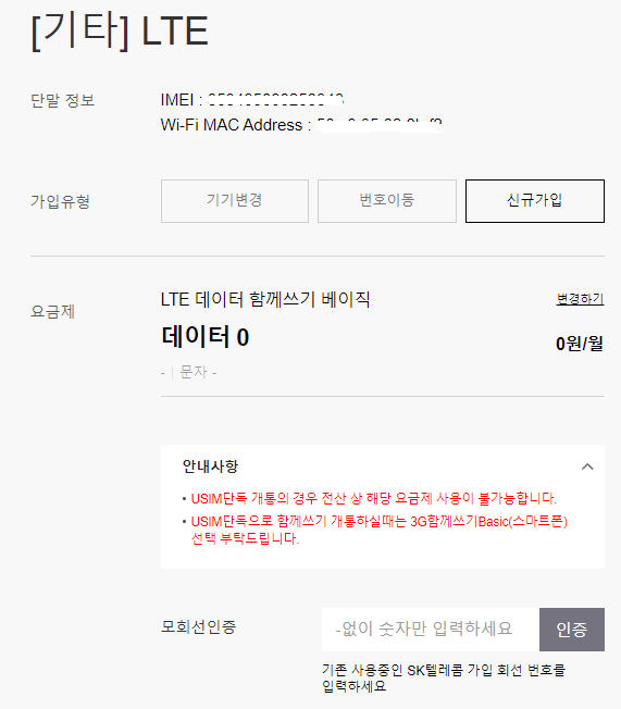 그리고 가입유형을 신규가입을 선택하고 요금제를 변경하면 됩니다.