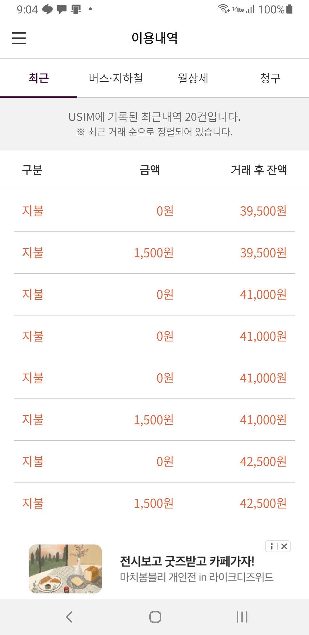 모바일티머니앱을 다시 설치해서 이용내역을 확인하니 요 몇일간 K-패스 카카오페이 교통카드가 안 먹히고 티머니앱도 없는 상태에서 USIM에 정보가 남아있는건지 이전 카드로 교통카드가 결제되었네요~
