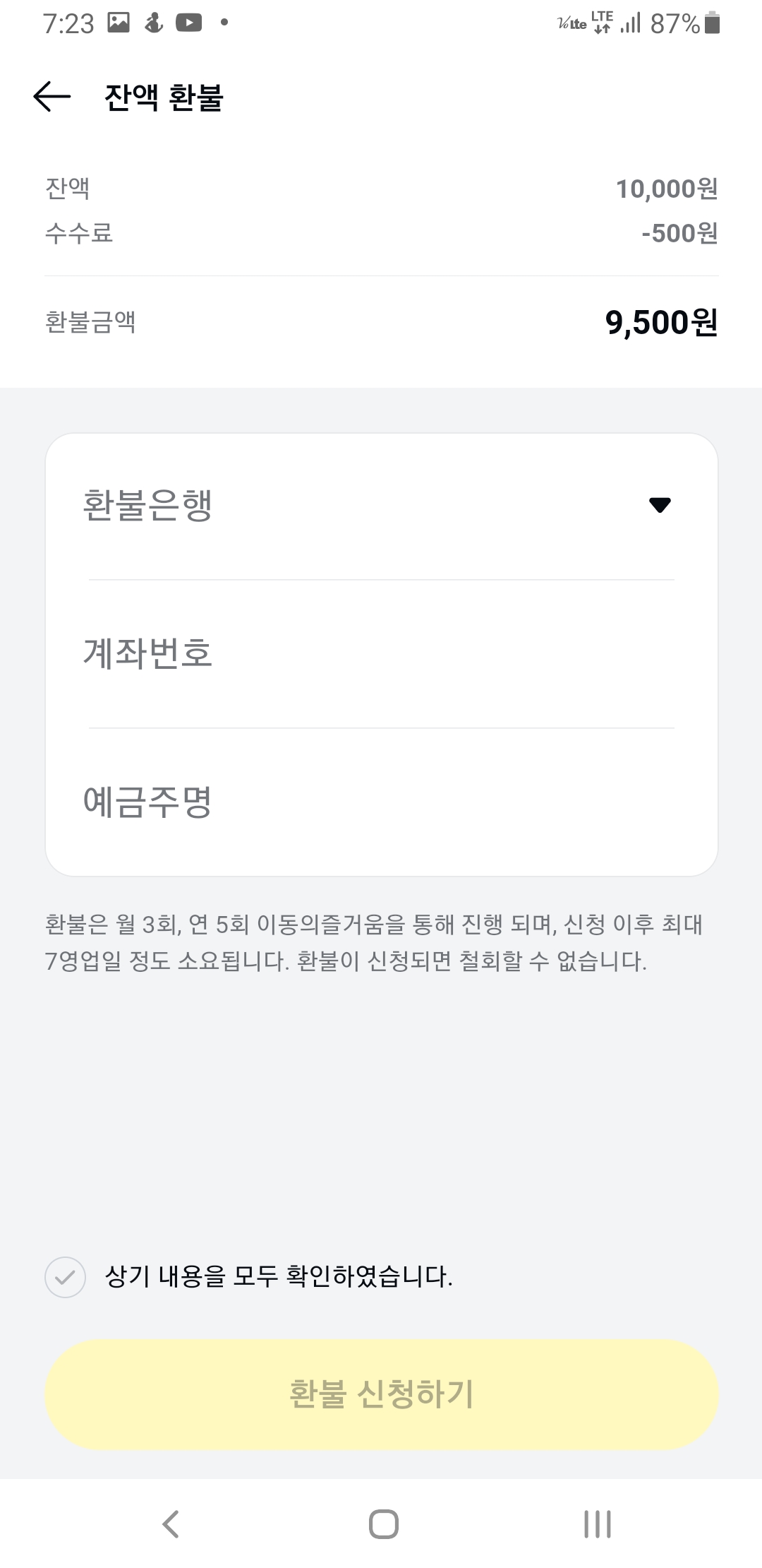 한번도 이용못하고 환불 신청하려니 수수료가 500원입니다.