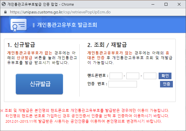 신규발급을 누르면 팝업이 차단되었다는 메시지가 뜨는데 팝업차단을 해제합니다.