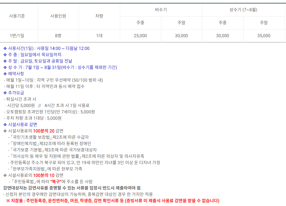 이용요금은 비수기 기준 주중 25,000원, 주말 30,000원 인데 북구 주민한테는 우선예약 혜택과 10% 할인 혜택이 있는 것 같습니다.