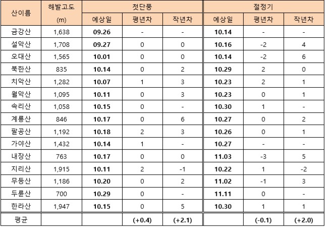 올해 첫 단풍 평년보다 1일 느릴 듯 단풍 절정은 평년보다 0~2일 느릴 듯 ( 9월 27일 설악산에서 첫 단풍 시작, 단풍 절정은 설악산 10월 16일, 내장산 11월 3일 ) □ 웨더아이(대표 김영도)는 올해 첫 단풍은 평년과 비슷하거나, 조금 느릴 것으로 전망된다고 밝혔다. ( 첫 단풍 : 산 전체로 보아 정상에서부터 20% 가량 단풍이 들었을 때 ) ○ 9월 27일 설악산을 시작으로, 중부지방에서는 10월 14~17일, 지리산과 남부지방에서는