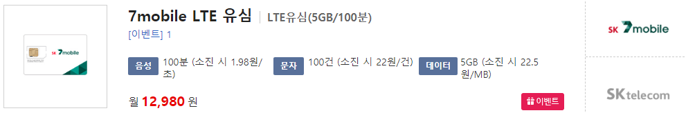 7mobile LTE유심(5GB/100분)