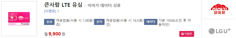 ▶ 큰사람 LTE 0원 요금제 이벤트 중이네요~ ( 음성 30분, 문자 0건, 데이터 100MB )