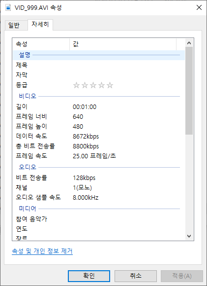 후방 녹화파일은 해상도가 640 x 480 25fps, 63메가(66,000,000바이트) 단위로 AVI 파일로 쪼개져서 저장되네요~