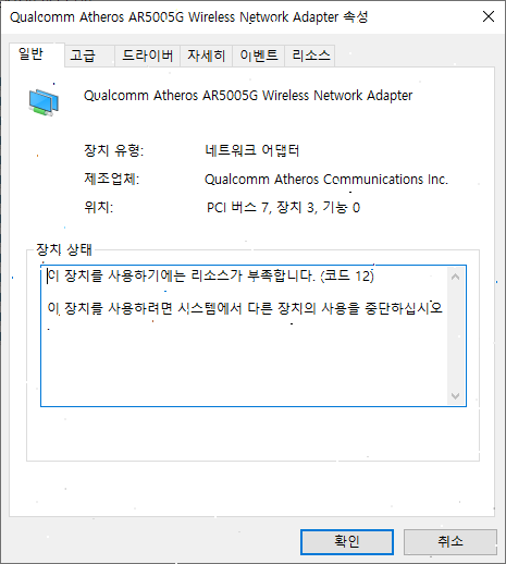 이 장치를 사용하기에는 리소스가 부족합니다. (코드 12)