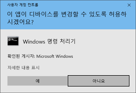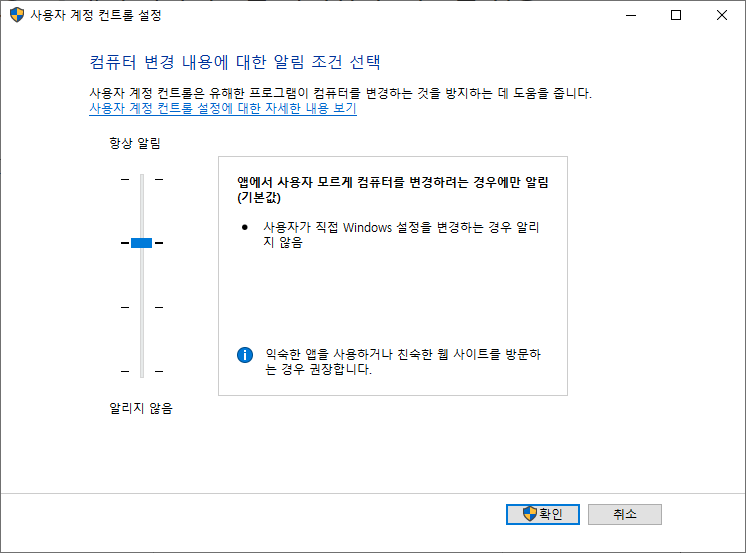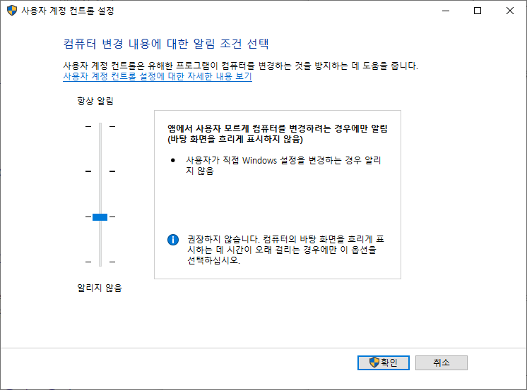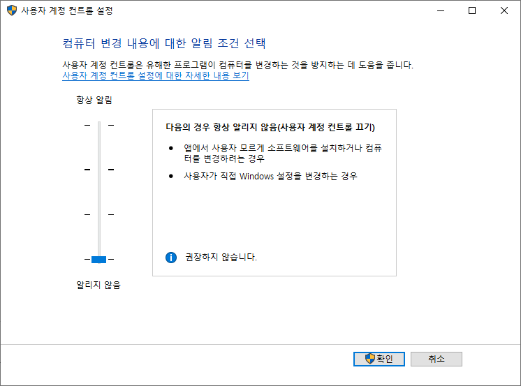 시커먼 화면이 싫거나 묻는게 싫다면 설정에서 사용자 계정 컨트롤을 호출합니다.