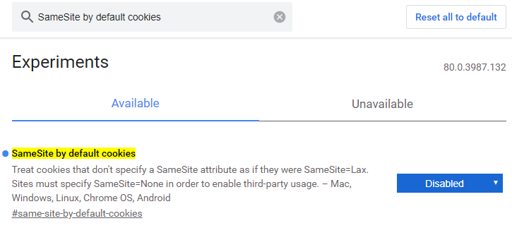 그리고 SameSite by default cookies 를 검색해서 Disabled 로 설정합니다.