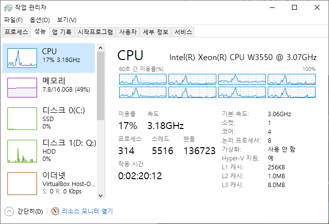 가상화기술이 켜져있는지 확인하는 방법은 작업관리자 -> 성능 -> 가상화를 확인하면 됩니다.