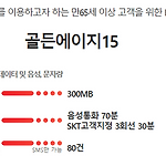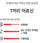 SKT T끼리 어르신 요금제 부모님이 만65세가 넘으셨다면 골든에이지15나 T끼리 어르신 요금제가 가성비가 괜찮아 보입니다~ 데이터 300MBSKT 고객간 무제한 통화 + 70분19,800 + 2,200(LTE안심데이터) = 22,000원 이 정도면 추천할 만 하네요~(온가족할인 적용시 20년 이상 10%, 30년 이상 30% 할인) 골든에이지15는 데이터 300MB음성통화 70분, 문자 80건이며 LTE안심데이터 부가서비스는 3,850원입니다. 가족이 SKT 라면 T끼리 어르신 요금제가 나아보입니다.